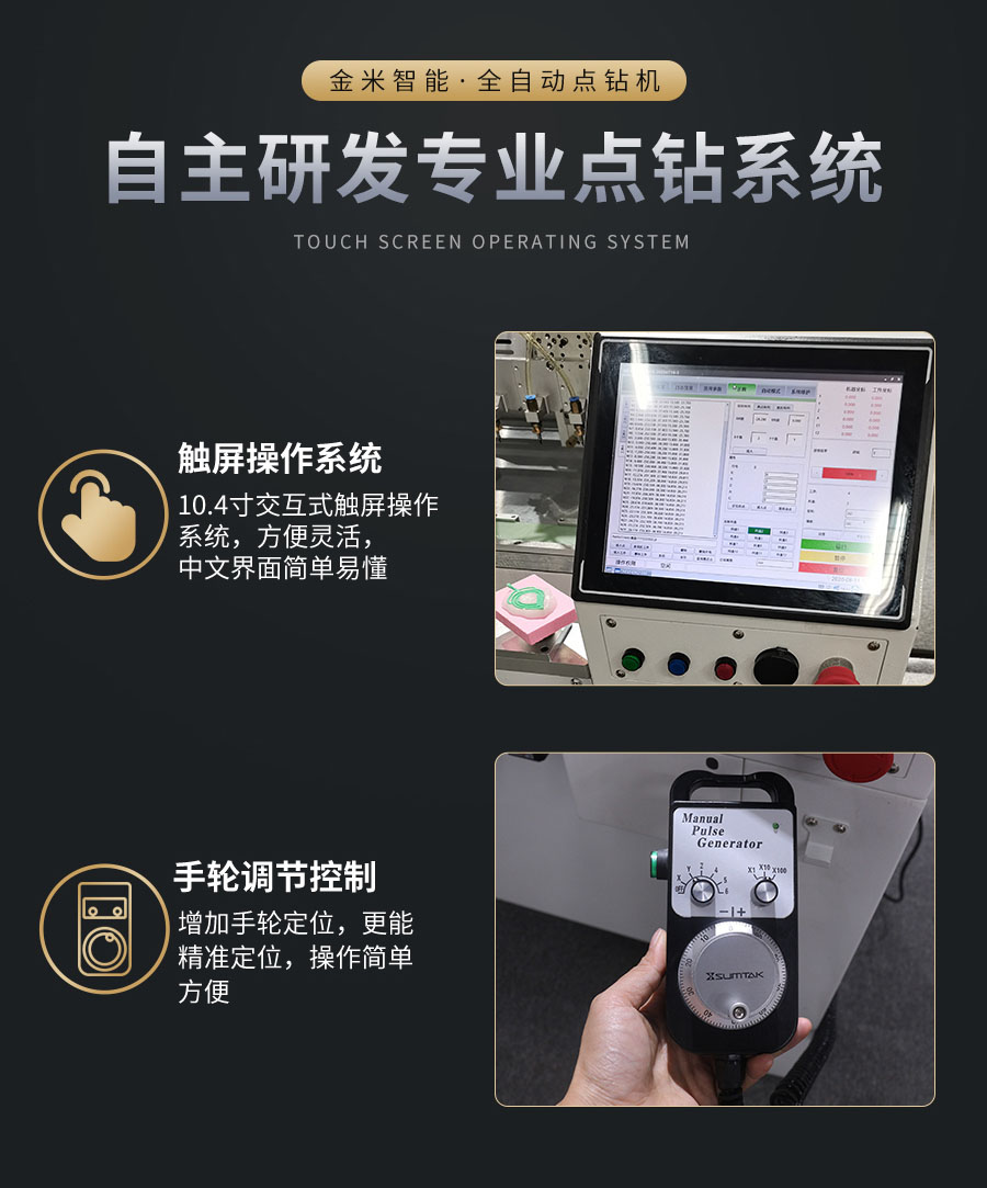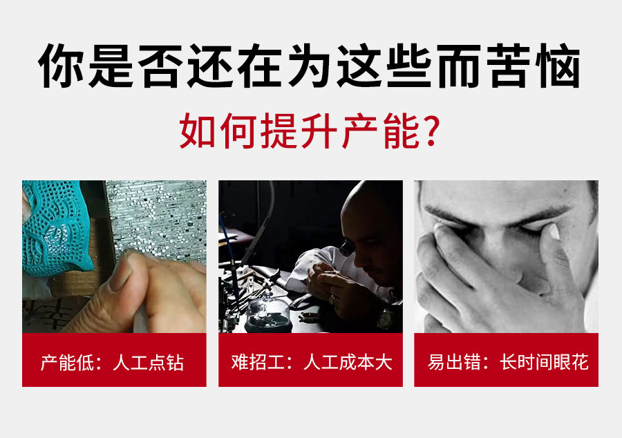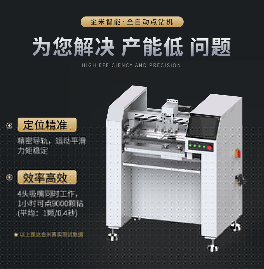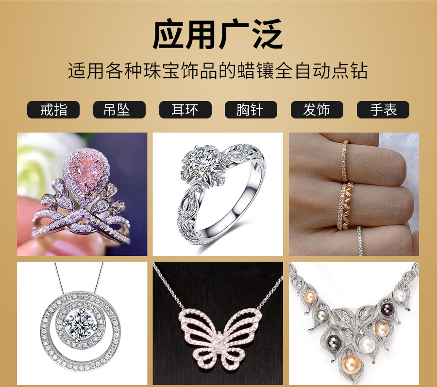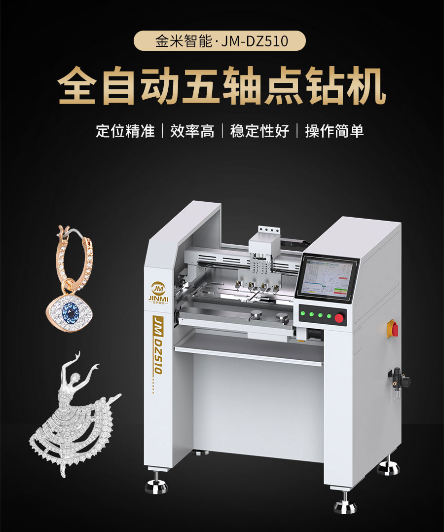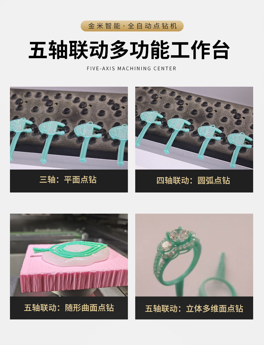 全自動五軸點鉆機,是金米智能專門用于解決珠寶首飾鑲鉆效率低而研發的產品。可用于戒指、吊墜、耳飾、胸針、手表等各種帶鉆的珠寶飾品。五軸聯動多功能,平面、圓弧、立體多維面自動。定位精準,效率高,1機最多可頂替8個人工,1小時可點9000顆鉆(4頭吸嘴真實測試數據)。10.4寸中文觸屏操作系統,傻瓜式操作,簡單易學。 可試機打樣!