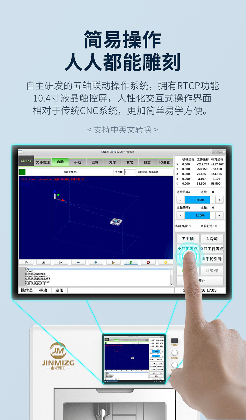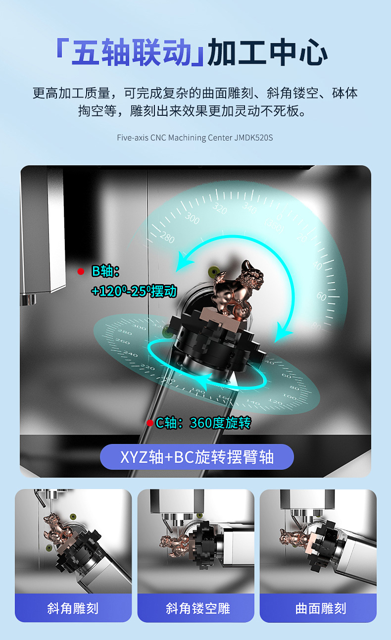 1、JMDK52s0是一款專用于雕刻精品的小型五軸雕刻機(jī)。2、五軸聯(lián)動(dòng)技術(shù),可滿足不同加工需求,鏤空雕刻、砵體掏空、弧面雕刻、不規(guī)則體雕刻等。比如一些立體手把件、立體擺件、神獸擺件、精品印章、佛像雕刻等。3、搖擺式雕刻工作臺(tái),C軸360度旋轉(zhuǎn),B軸145度擺動(dòng)。4、迷你機(jī)身設(shè)計(jì),體積如同一臺(tái)小冰箱,可進(jìn)家門,可進(jìn)電梯。5、移動(dòng)更加的方便。全封閉式加工倉設(shè)計(jì),更加的靜音環(huán)保。6、操作系統(tǒng)采用五軸智能觸控屏,10.4寸觸控屏,操作更靈活,更加直觀的操作方式。7、適合雕刻材料:玉石翡翠、銅、鋁、木材、人造材料等。
